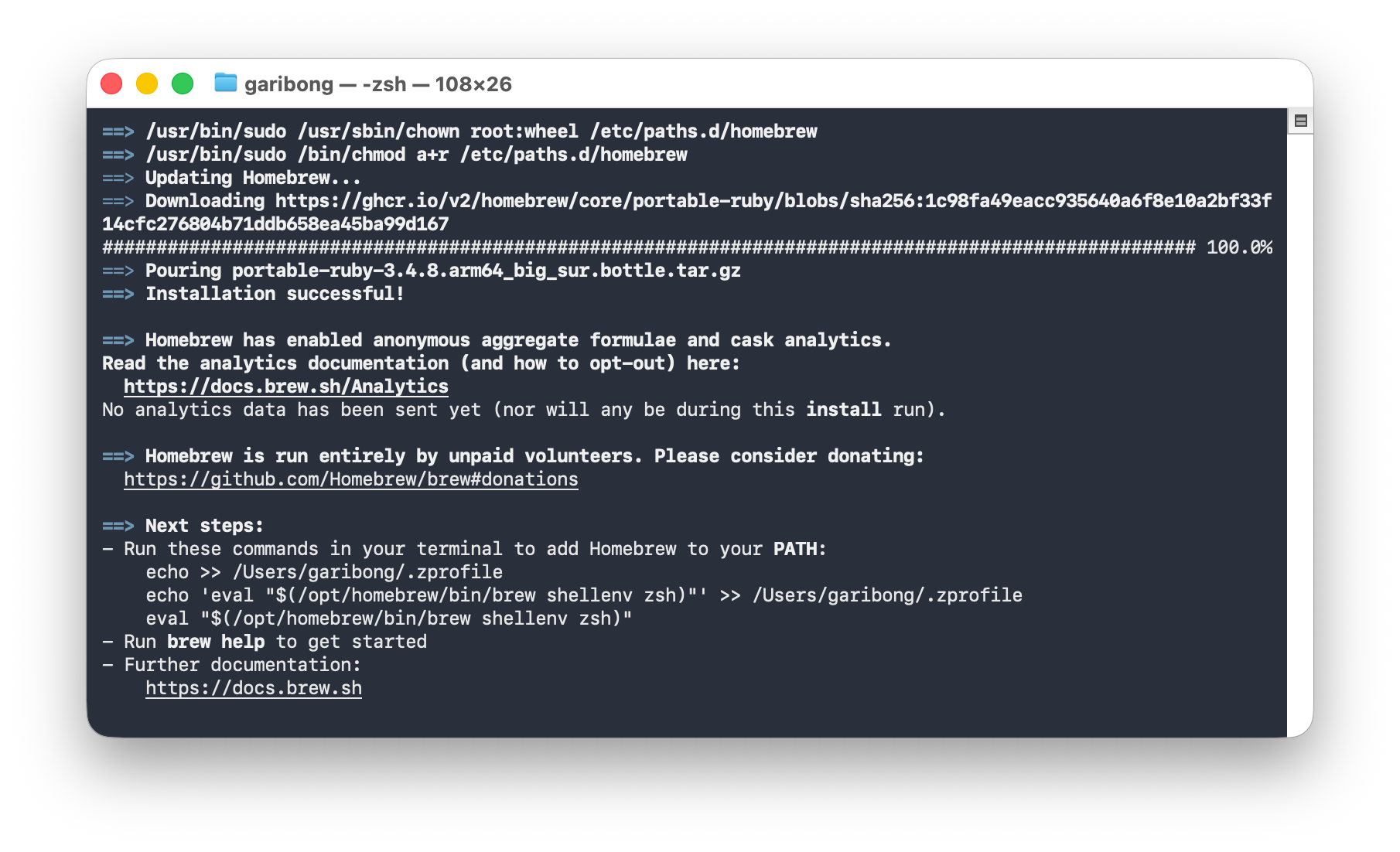 설치가 쭉 진행되다가 끝나갈 즈음, 로그 마지막에 Next steps: 라며 PATH 설정 명령어를 친절하게 알려준다. 이 세 줄의 명령어를 드래그해서 복사한 다음, 터미널에 한 번에 붙여넣고 엔터를 치면 된다.
