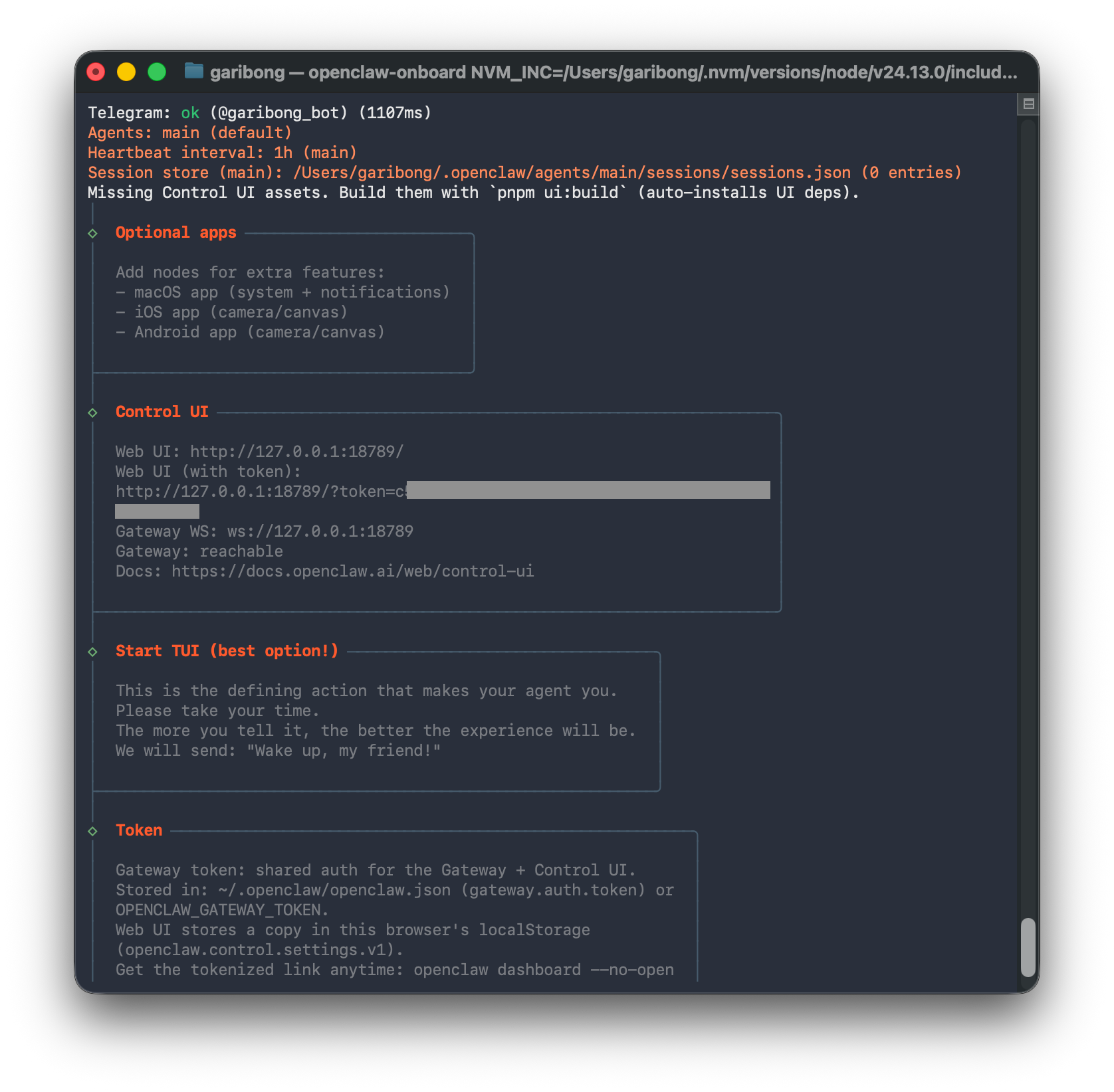 │ Gateway token: shared auth for the Gateway + Control UI. │