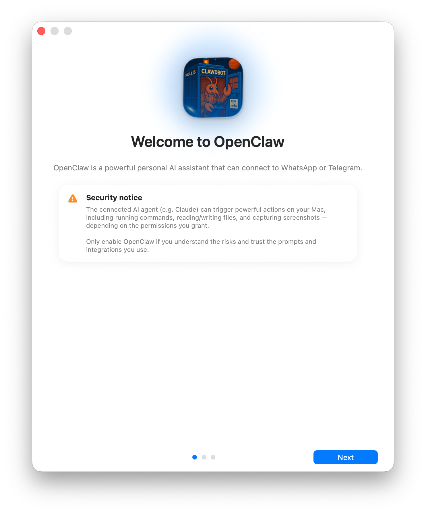 OpenClaw-2026.1.29.dmg 파일을 다운로드 받고 Applications 폴더로 이동시켜서 설치했다. OpenClaw 앱을 실행하면 오른쪽 그림과 같이 창이 뜬다.