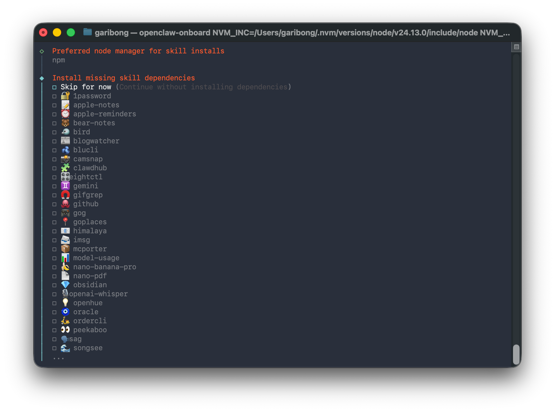 추가 설정이나 의존성이 필요한 skill 목록이 표시된다. 많다.. 'Skip for now'를 선택하고 다음으로 넘어갔다. skill은 사용 중에 필요성을 느끼면 손쉽게 바로 설치할 수 있다.