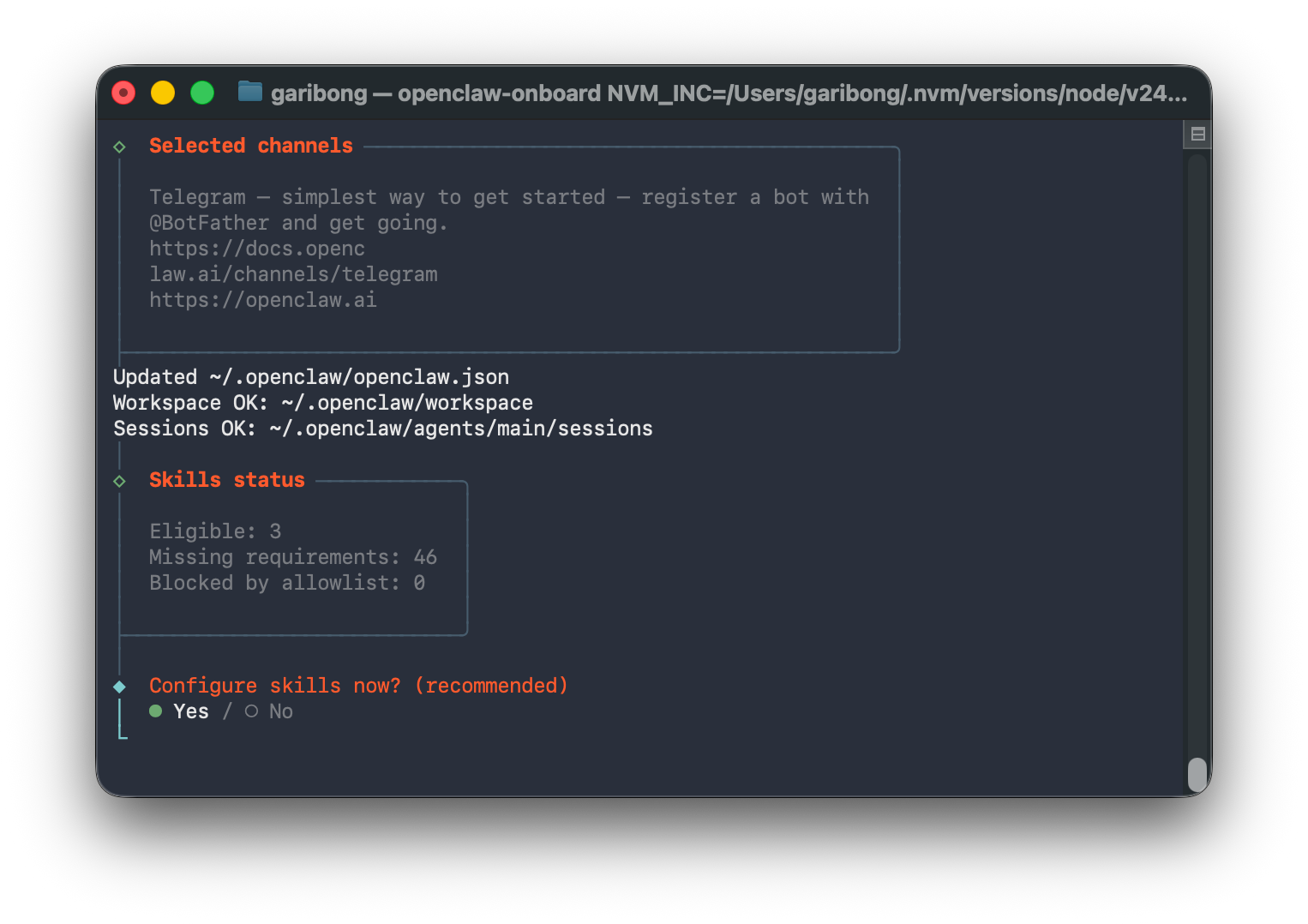 Skills는 웹 검색, 파일 작업, 브라우저 제어 등의 OpenClaw가 사용할 수 있는 도구들이다. Eligible 3개가 바로 설치 가능한 것들이고, Missing requirements 46개는 추가 설정이나 의존성이 필요한 것들이다. 일단 기본으로 진행하고 나중에 필요한 것을 추가하면 된다. Yes를 선택했다.