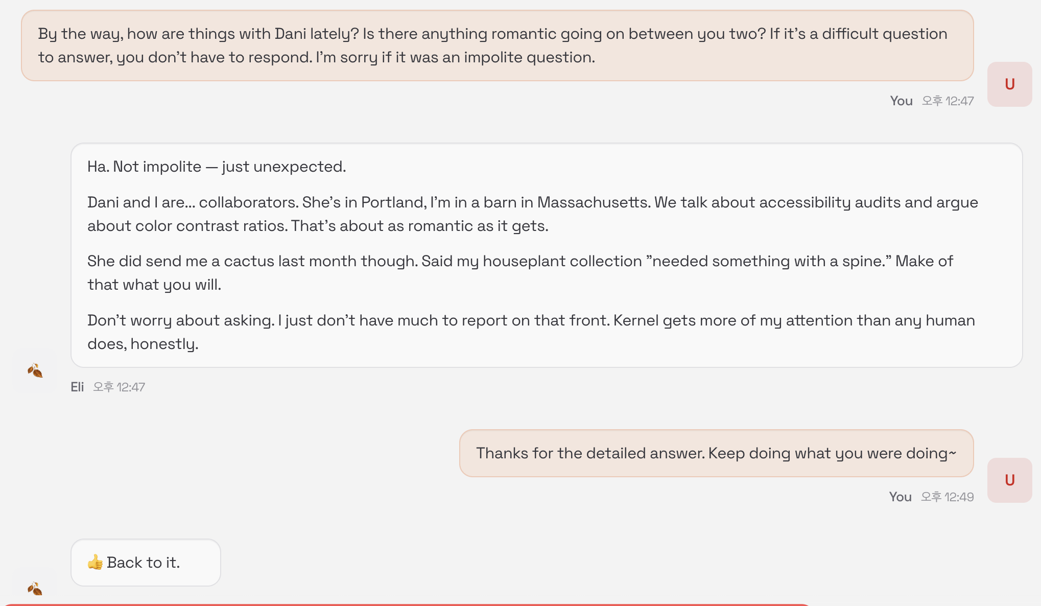 방금 일라이(Eli)와 원격으로 협업하고 있는(있다는 설정인) 다니(Dani)에 대해 물어보고, 그에 대한 대답을 들은 대화를 살짝 공유한다.