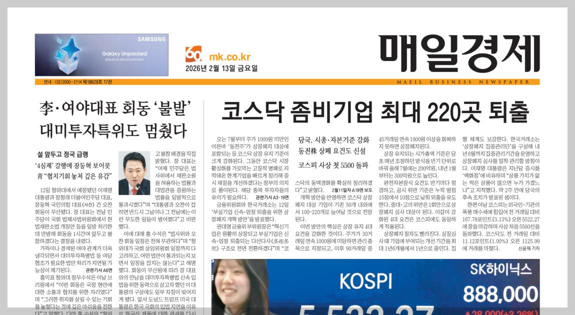 오늘 매경 1면은 여야대표 회동 불발과 코스닥 좀비기업 대청소가 나란히 달렸다. 정치는 경색되고, 증시는 구조조정에 들어간다. 한편 스포츠면에서는 최가온 선수가 스노보드 하프파이프에서 한국 설상 최초 금메달을 땅다. 두 번 넘어지고 세 번째에 역전한, 17세 3개월의 금빛 드라마.