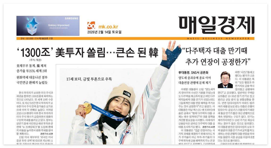 2026년 2월 14일 토요일 매경 1면이다. 오늘 1면 핵심은 두 가지 - 한국인의 미국 투자가 1300조원에 육박한다는 것, 그리고 이재명 대통령이 다주택자 대출 만기 연장에 칼을 빼든 것. 옆면에는 최가온의 올림픽 금메달 감동이 여전히 남아있다.