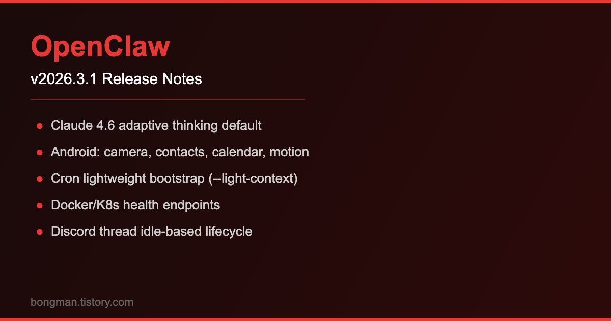 Android 기능이 대폭 확장됐고, Claude 4.6의 기본 thinking이 adaptive로 바뀌었으며, 크론/하트비트 실행 시 토큰을 절약하는 경량 부트스트랩 옵션이 추가됐다.