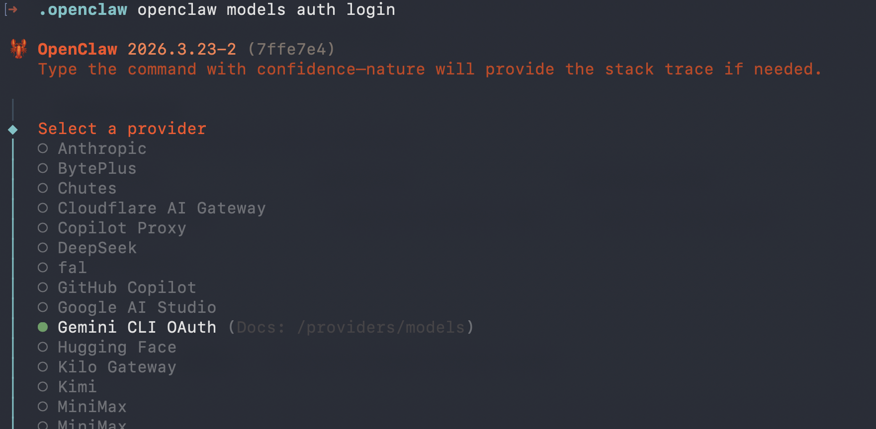 터미널에서 'openclaw models' 명령을 실행해서 위와 같이 "google-gemini-cli usage: Pro 100% left" 또는 "google-gemini-cli:your@gmail.com ok expires in Xm" 같은 구문이 표시되는 것을 확인한다.