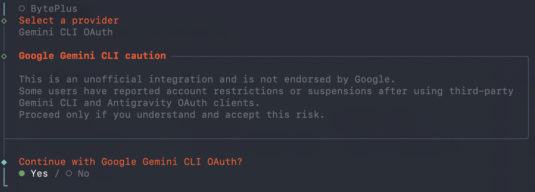 이후 위와 같은 경고 문구가 표시된다. Google이 비공식 OAuth 클라이언트를 통한 Gemini CLI OAuth 접근을 제한하기 시작했고, Google Antigravity 사용자들 사이에서 계정 제한 보고가 나오고 있다. 이러한 위험성을 인식하고 진행하라는 경고다. 글 서두에 언급했지만 계정이 제한될 수도 있으니 이를 인지하고 이후 절차를 진행하기 바란다.