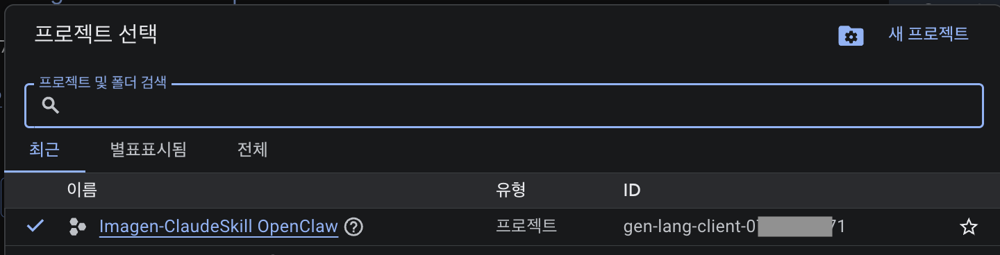 위 그림과 같이 프로젝트 선택 창의 ID 항목(gen-lang-client~)이 프로젝트 ID다. 아래와 같이 ~/.openclaw/.env 파일에 Google Cloud 프로젝트 ID를 지정한다.