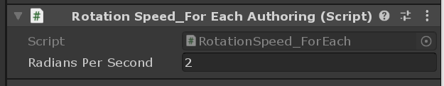 RotationSpeed_ForEach 구조체 코드를 다시 보면 [GenerateAuthoringComponent] 속성(attribute)이 붙어있다. 이게 붙으면 유니티 에디터의 Inspector 창에 해당 구조체의 public 필드(filed)가 보이고 값을 수정할 수도 있다.