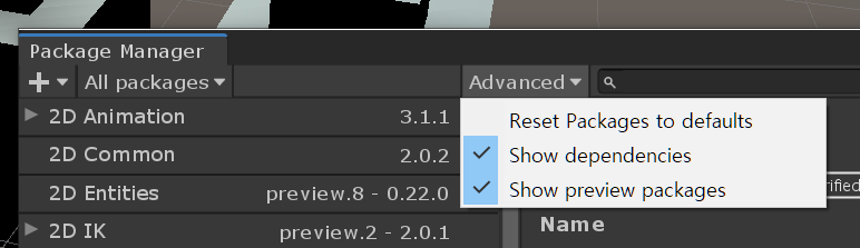 - 윈도우 상단의 Advanced 메뉴를 열고 "Show preview packages' 옵션을 켠다.