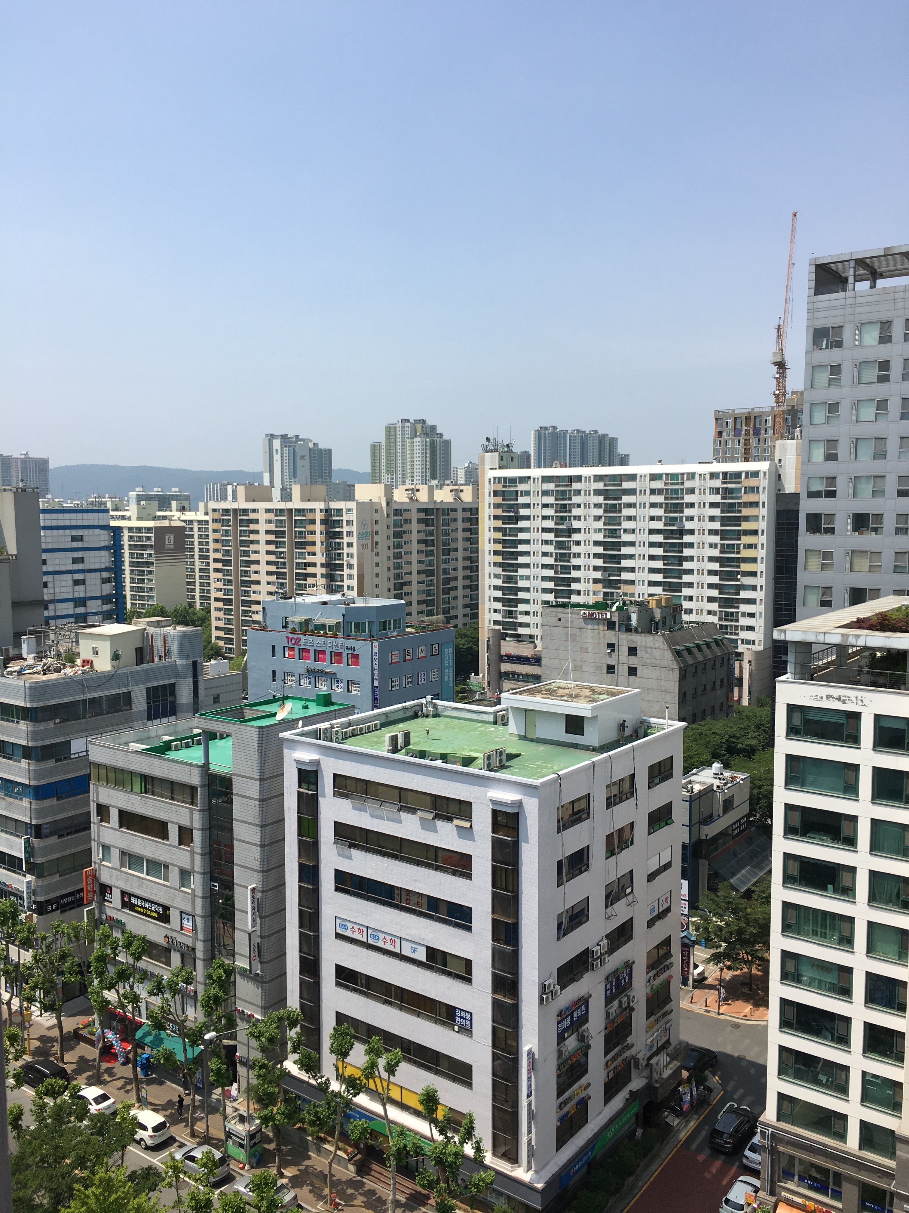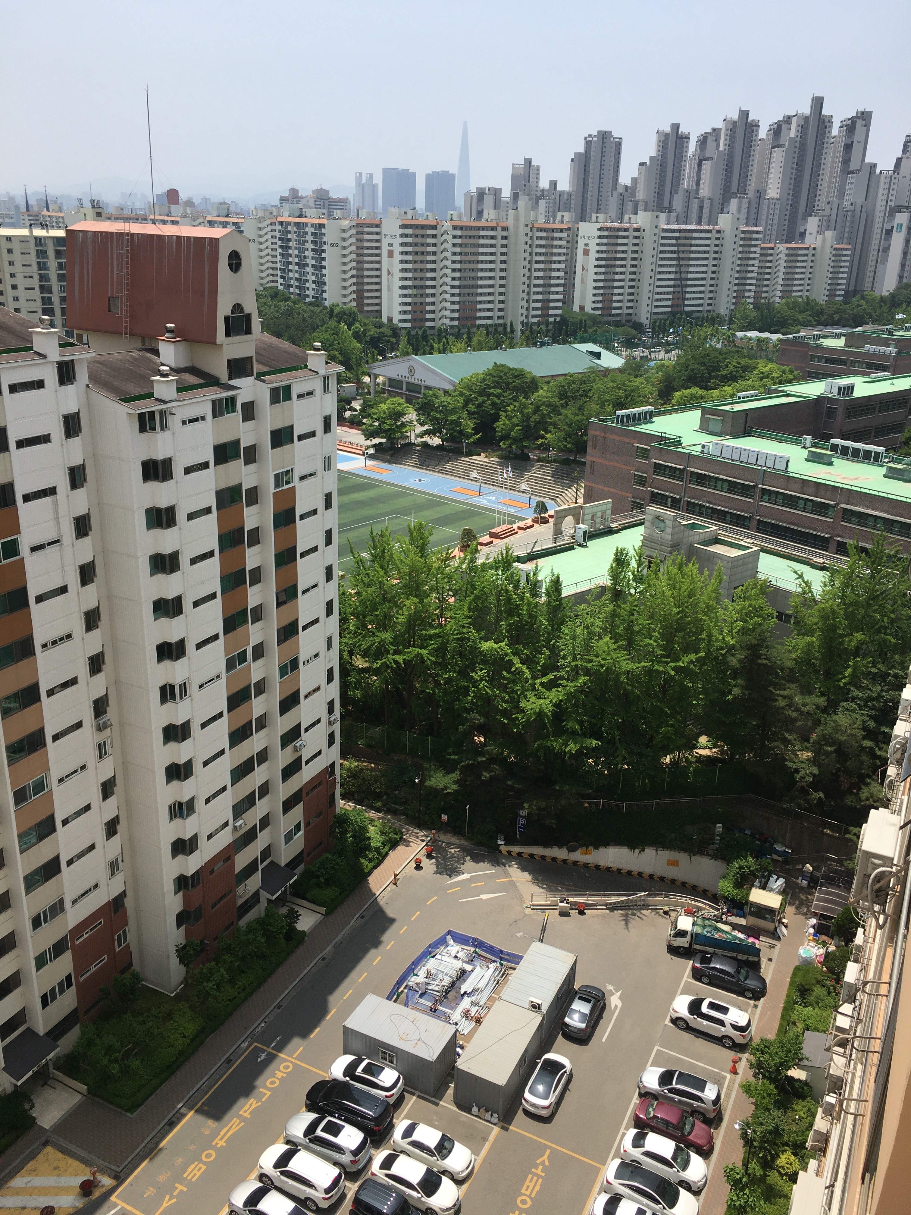 명일한양아파트 15층 꼭대기에 올라가 복도 창을 통해 밖을 바라봤다. 왼편으로 이마트 뒤 상점가들이, 그 뒤로 삼환아파트가 보였다. 저 멀리 처음에 들렀던 고덕래미안힐스테이트가 희미하게 보였다. 오른편으로는 강동경희대병원이 보였다.
