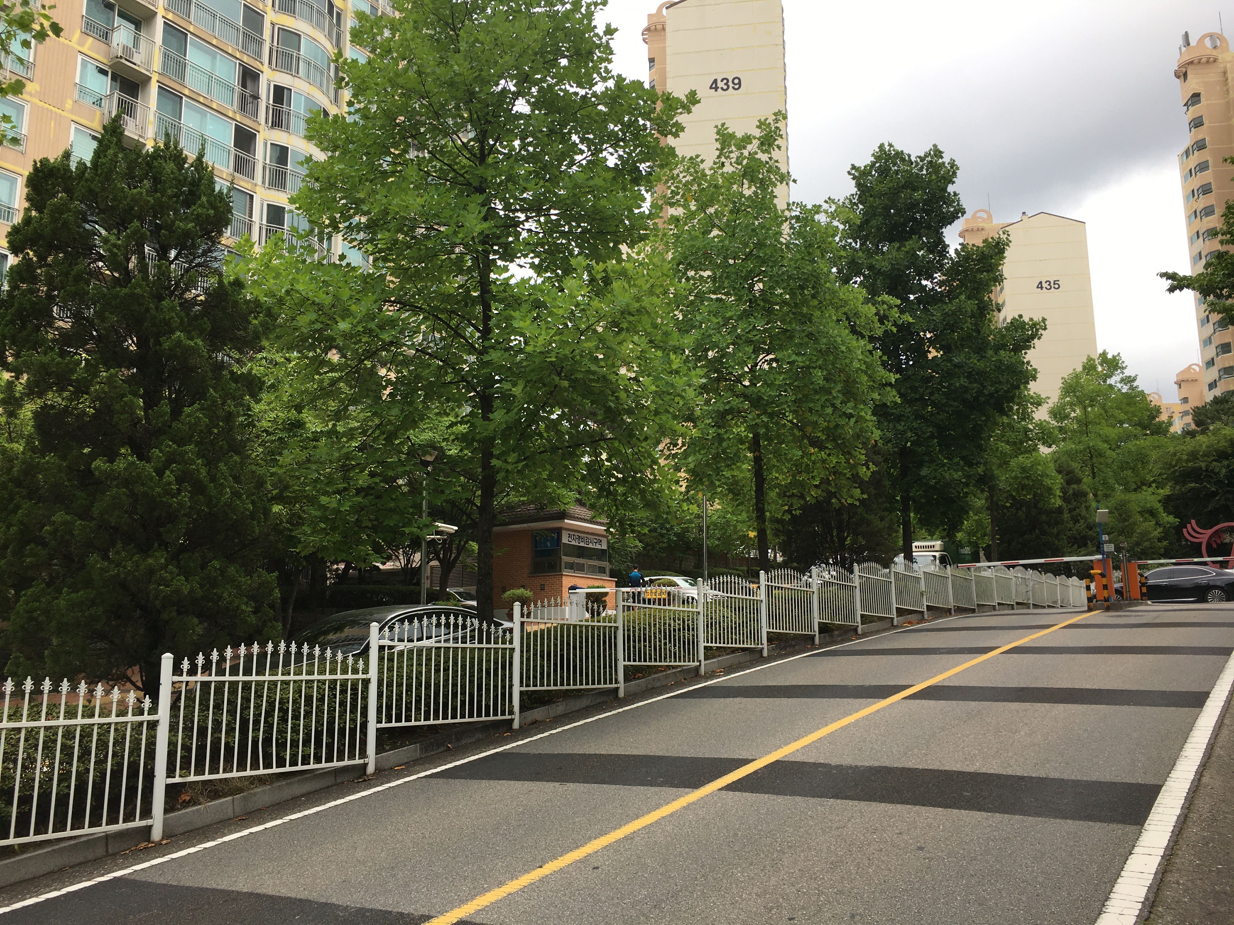 오른쪽 4단지 입구로 들어갔는데 왼편의 3단지와는 철제 펜스로 분리돼 있었다. 입구도 같이 쓰는데 왜 굳이 경계를 분리했는지 의아했다.