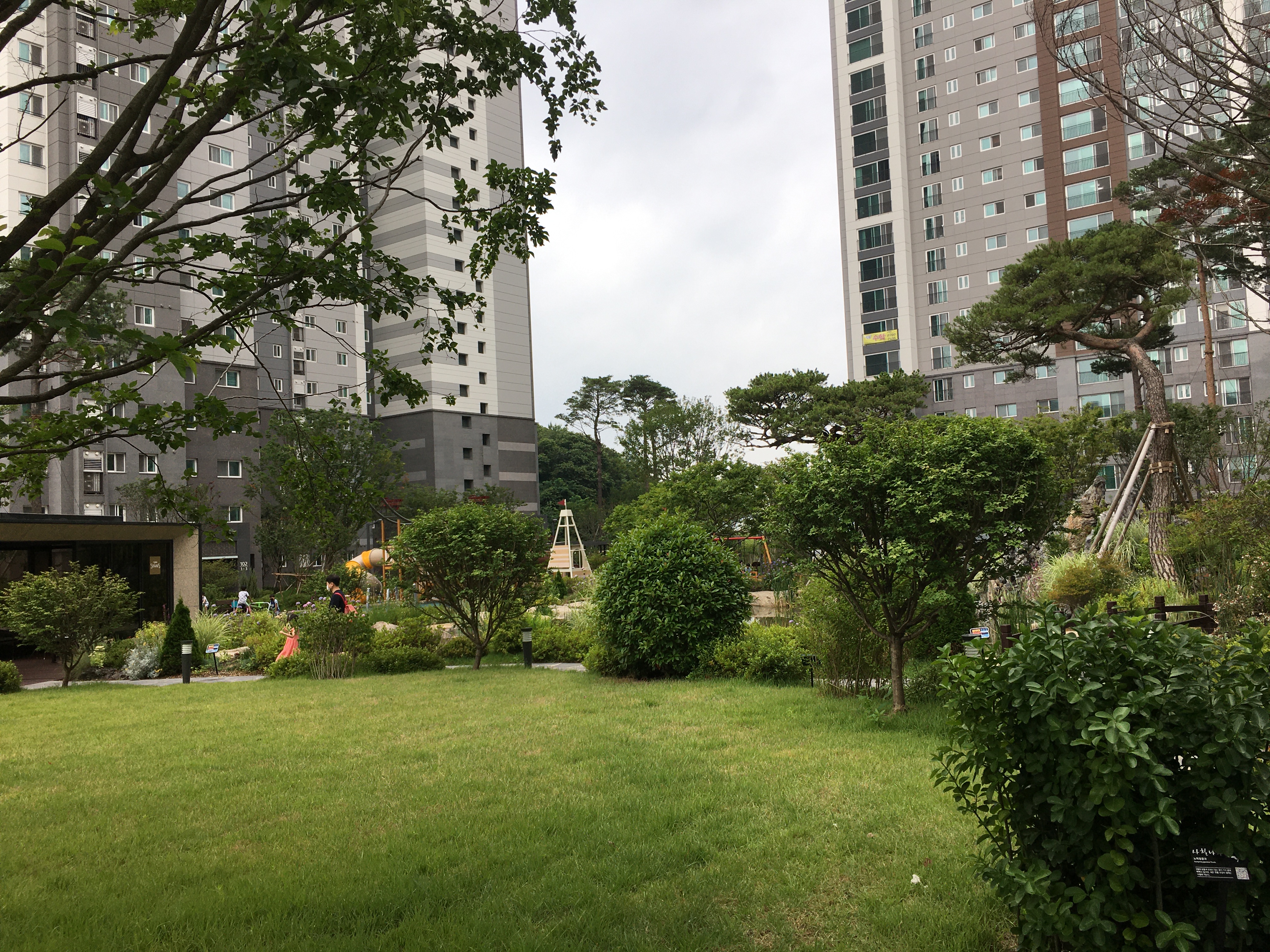 기사에 의하면 단지에는 대형 놀이터, 석가산, 생태연못 등이 있는 축구장 2개 규모 2만3000㎡의 중앙광장을 조성했다고 한다. 또 중앙광장을 중심으로 법정 수량보다 많은 식재로 계정마다 화려한 조경을 연출했다고. 식재를 많이 조성했다는 사실에는 이견이 없지만 축구장 2개 규모는 아닌 것 같다. 규모가 크다는 느낌보다는 아기자기하다는 느낌이 더 강했다.