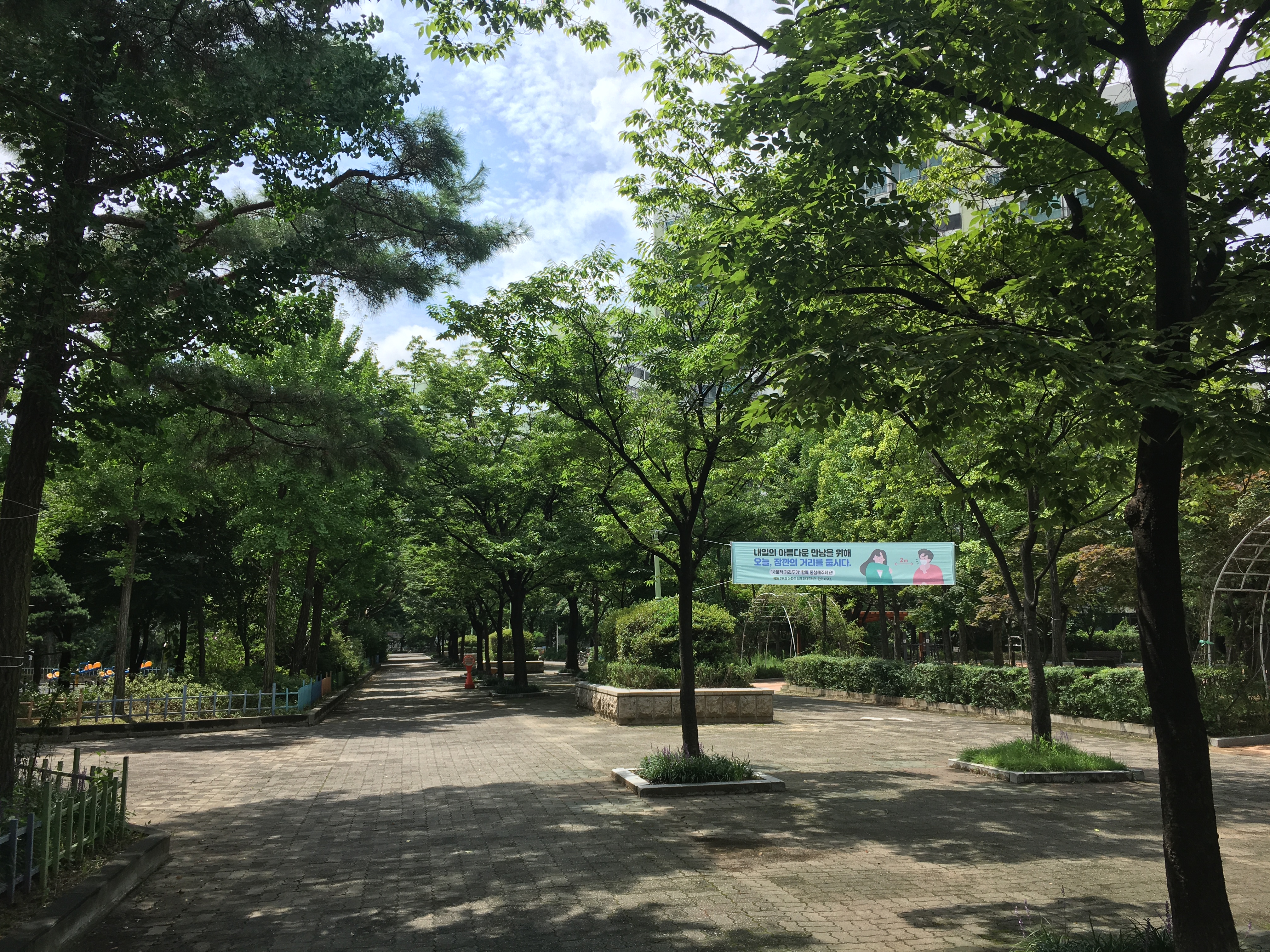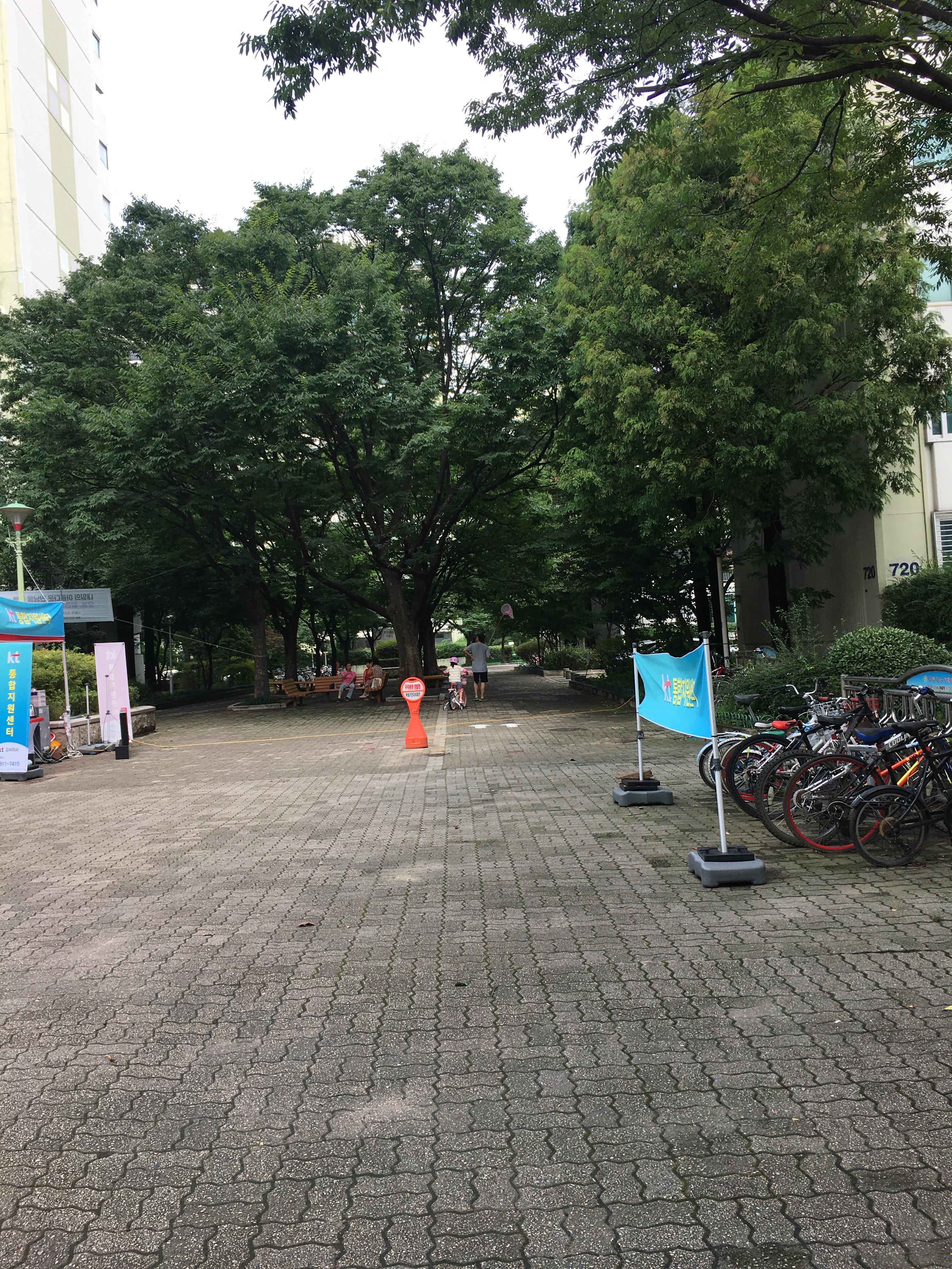 차량이 출입하지 못하게 막아 놓은 공간이 상당히 넓었다. 여유롭게 산책을 즐기는 주민들과 자전거를 타고 돌아다니는 아이들이 종종 보였다. 나도 잠시 나무 그늘 밑 벤치에 앉아 매미 소리를 들으며 땀을 식혔다. 대단지 구축에서만 경험할 수 있는 특유의 여유로움과 정취가 느껴졌다.