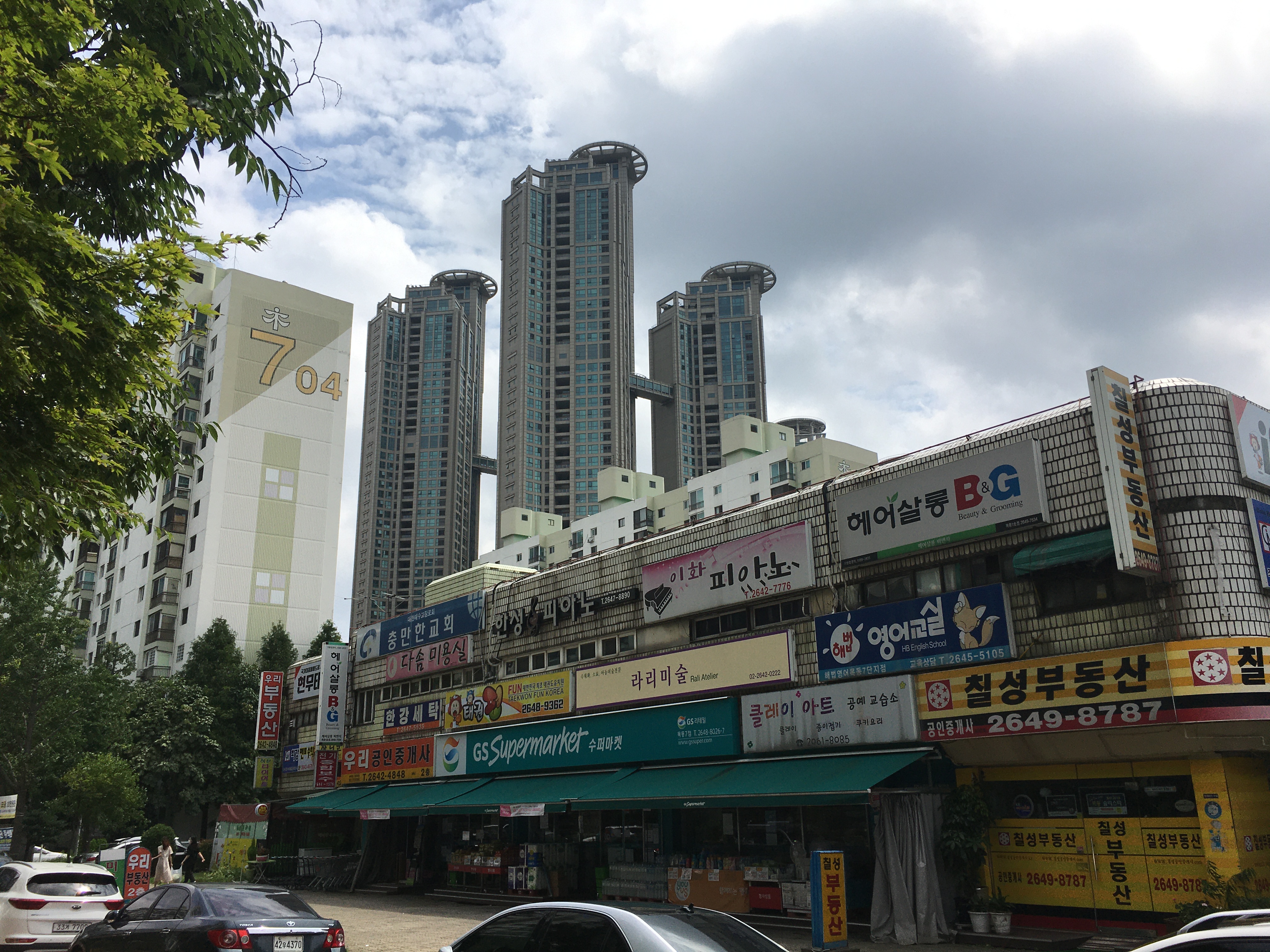 단지 내부 모습이다. 단지 내 상가에 규모가 꽤 커 보이는 GS슈퍼마켓이 있었다. 장을 보고 나오는 사람들이 많이 보였다. 주차 공간은 그리 여유로워 보이지 않았다.