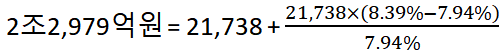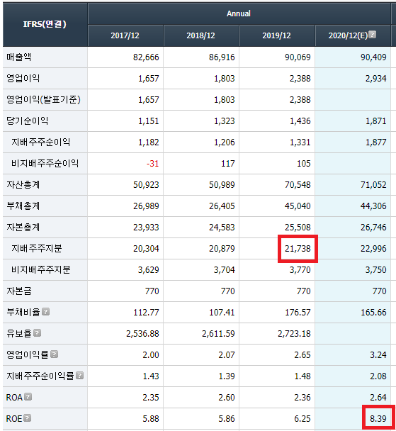 전년도 말 지배주주 지분은 2조 1,738억원이다. 올해 예상 ROE는 8.39다. 필요한 데이터는 모두 구했고 수식에 대입하기만 하면 된다.