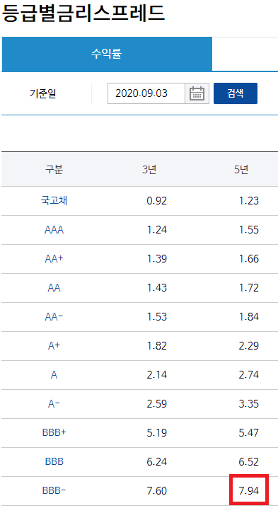 2020년 9월 3일 현재 BBB-등급 채권의 5년 수익률은 7.94%다.