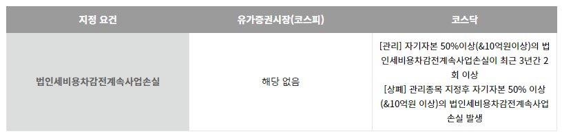 참고로 국내증권시장 관리종목 지정 및 상장폐지기준 중 재무와 관련된 네 가지 요건은 아래와 같다.