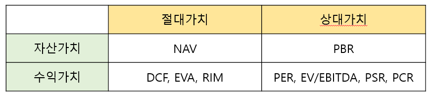 기업가치 평가방법은 크게 절대가치와 상대가치에 따라 분류되는데 절대가치가 이론적 우수성이 높다고 한다. 강사님의 책, '재무제표 모르면 주식투자 절대로 하지 마라'에서도 본 표다.