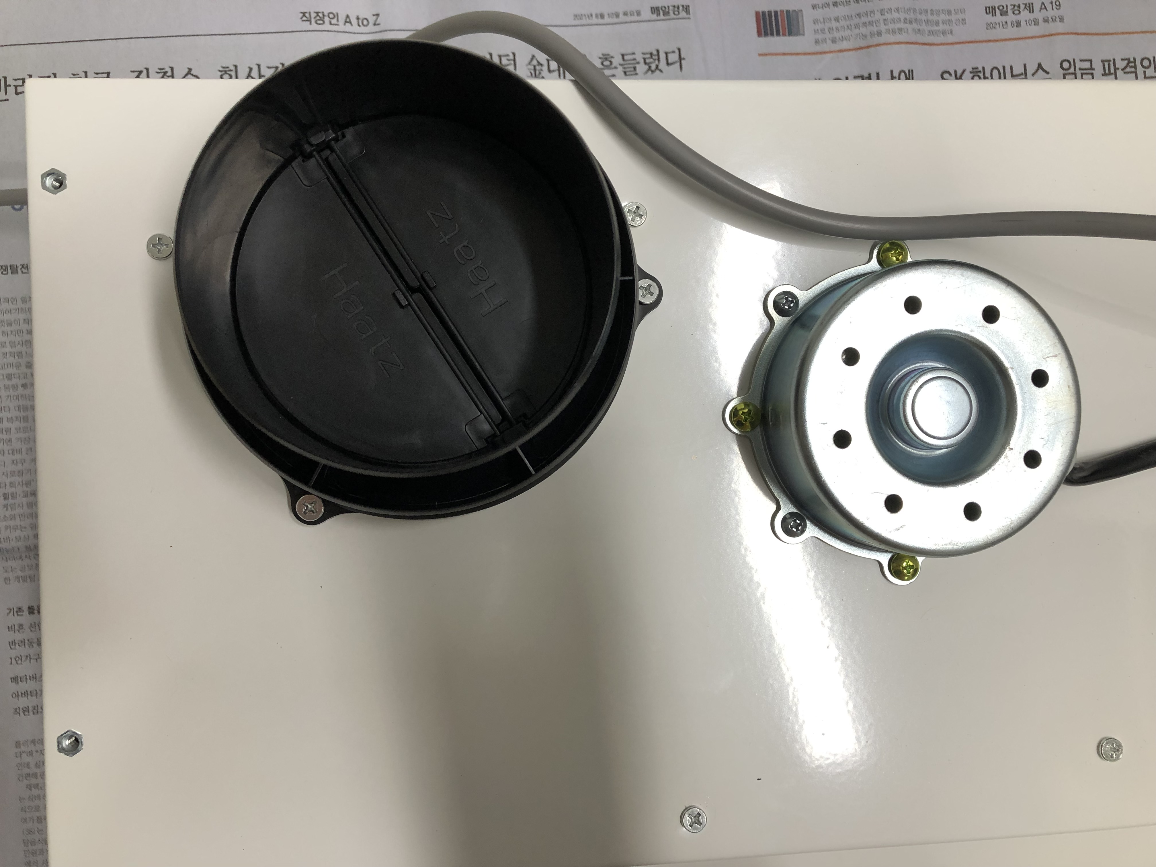 다음은 배기구를 제 위치에 놓고 나사로 고정하는 과정이었는데 한참 고생했다. 설명서에 배기구의 중심선이 수직(12시 방향)이 되게 맞추라고 쓰여 있는데 나사 구멍 때문에 어떻게 해도 수직이 되지 않았다. 11시 방향과 1시 방향으로 가 조립하고 각각 테스트했는데 1시 방향으로 하면 팬이 작동해도 오른쪽 날개만 열리고 닫혔다. 11시 방향으로 해야 양쪽 내부 날개가 모두 움직였다. 후드 팬이 작동하면 배기구 날개 부분이 열려서 냄새를 외부로 보내고, 팬이 꺼지면 닫혀서 외부 공기를 차단하는 원리다.