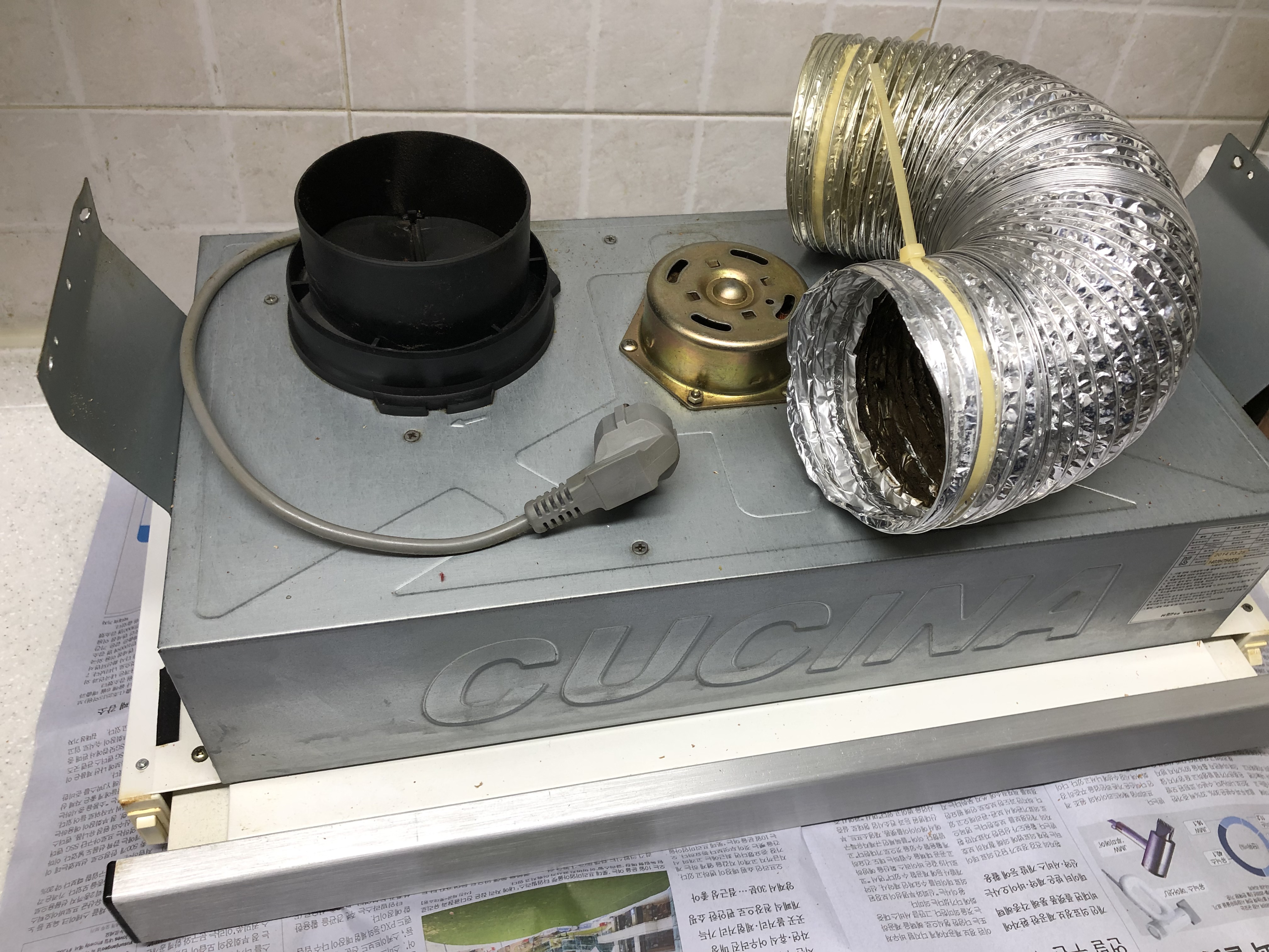 위 사진은 떼어낸 기존 후드다. 요리할 때마다 수시로 닦고 필터도 새로 교체해봤지만 한계에 다다랐다. 고기 냄새와 누런 얼룩이 둘러붙어서 너무나 지저분했다.