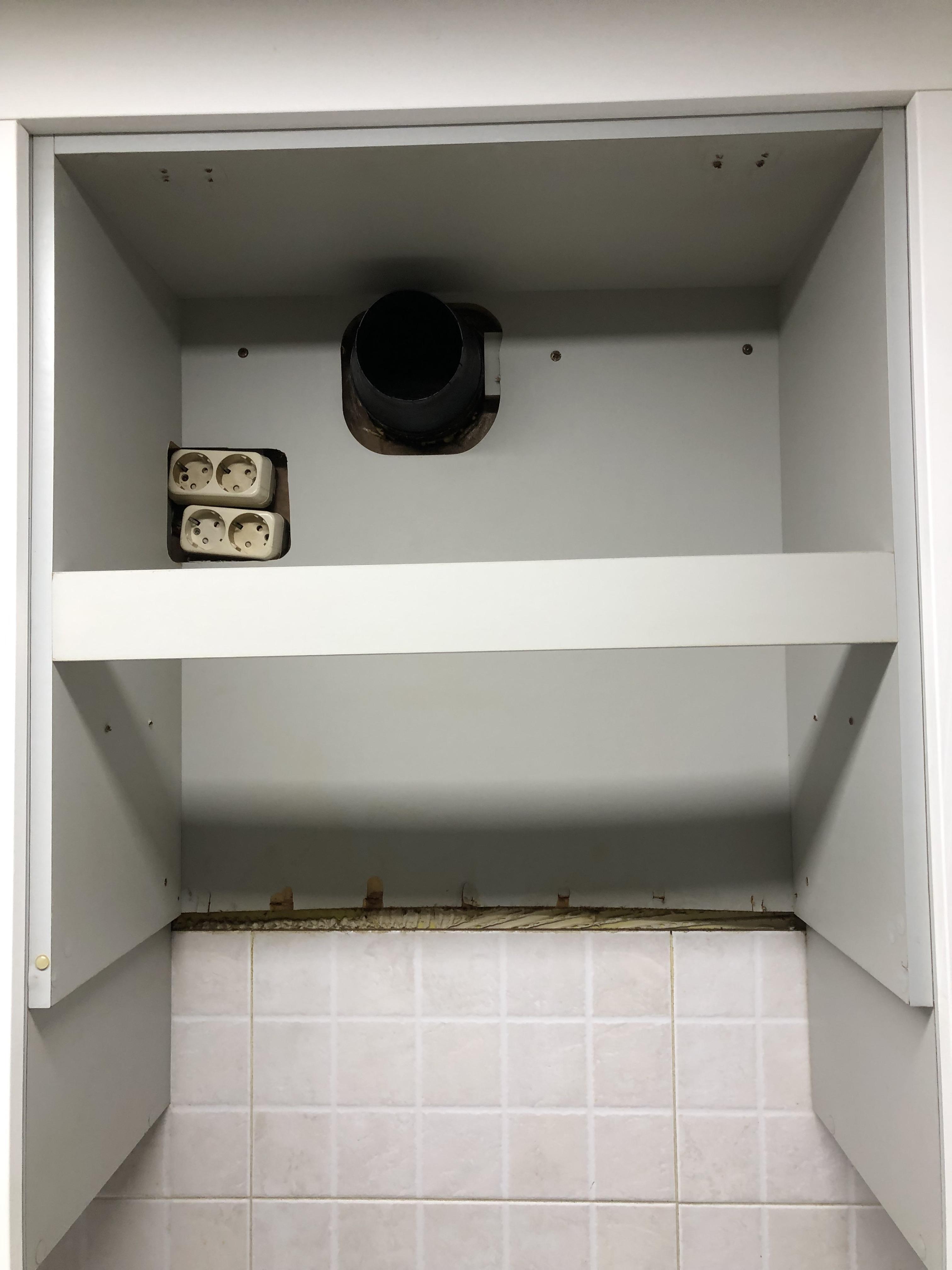 기존 후드를 떼어낸 후의 모습이다. 상부장 여기저기에 눌어붙은 얼룩을 물티슈로 최대한 닦아냈다. 뒤쪽 합판은 종잇장처럼 얇아서 힘을 주어 닦기 힘들었다. 벽 속으로 연결된 환풍구 내부도 많이 더러웠는데 끝부분만 살짝 닦고 말았다.