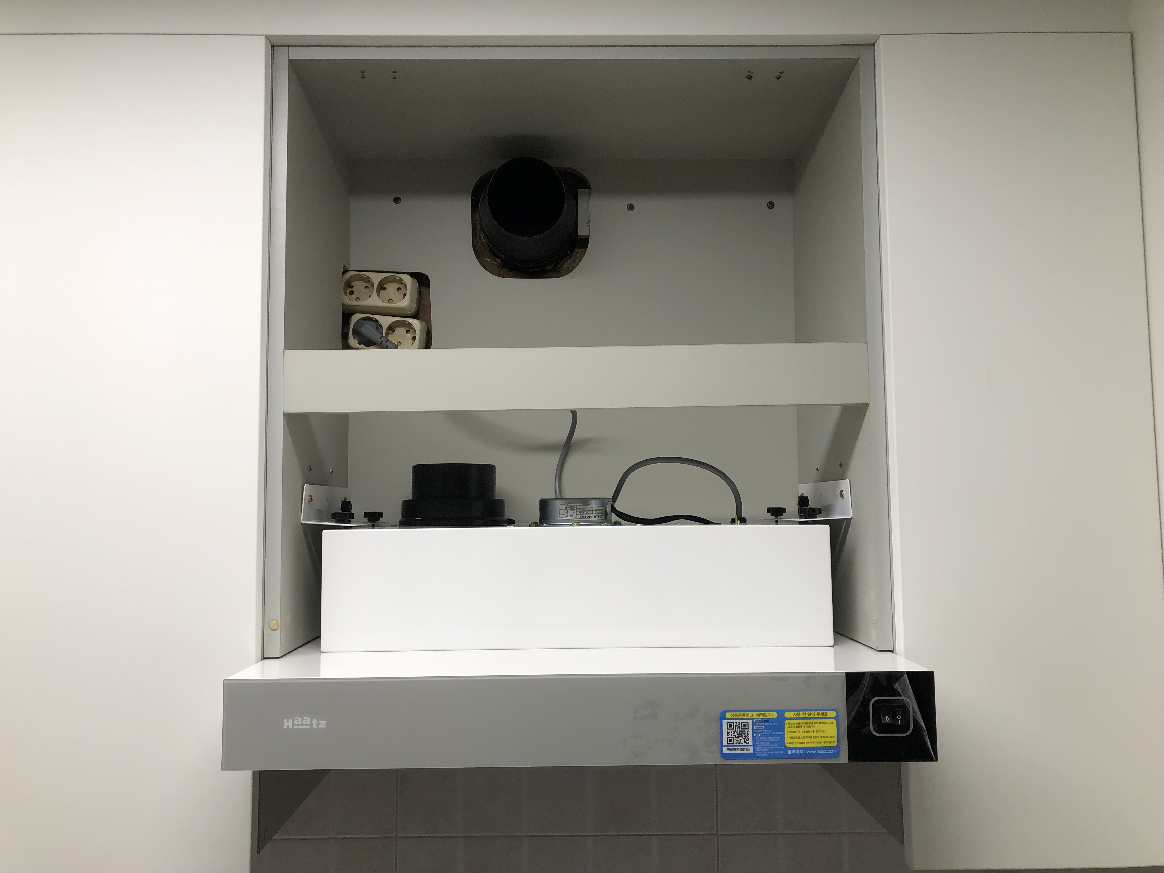 후드 본체를 싱크대 상부장에 장착한 모습이다. 후크라는 부품 덕에 본체를 위로 밀어올리는 동작만으로 본체를 대강 고정시킬 수 있었다. 후크 양 옆을 나사로 다시 고정해야 하는데 드라이버 없이 손으로 돌릴 수 있는 형태라 편했다. 다만 내가 힘이 약한 것인지 나사 구멍이 잘못된 것인지 아무리 돌려도 끝까지 들어가지 않았다. 떨어질 것 같진 않지만 찝찝하다.