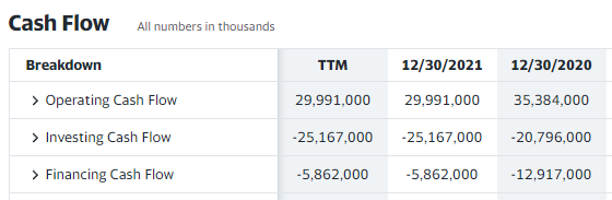 최근 12개월(TTM)의 영업활동으로 인한 현금흐름은 약 290억 달러이고, 과거에도 쭉 플러스였다. 돈을 잘 벌고 있다는 뜻이다. 다음으로 투자활동으로 인한 현금흐름은 -250억 달러나 된다. 최근 뉴스에 많이 나오는 것처럼 투자에 상당히 많은 돈을 쓰고 있다는 사실을 확인할 수 있다. 재무활동으로 인한 현금흐름은 -58억 달러로 부채 상환, 배당금 지급 등으로 인해 마이너스가 되는 것이 일반적이다.