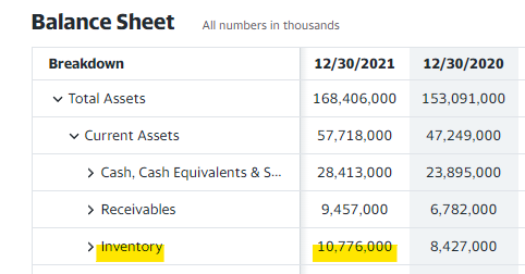 유동자산은 577억 달러, 유동부채는 274억 달러다. 유동비율은 약 210%로 매우 안정적이다. 다음으로 유동자산에서 재고 자산을 뺀 값을 유동부채로 나눈 당좌비율을 알아보겠다.
