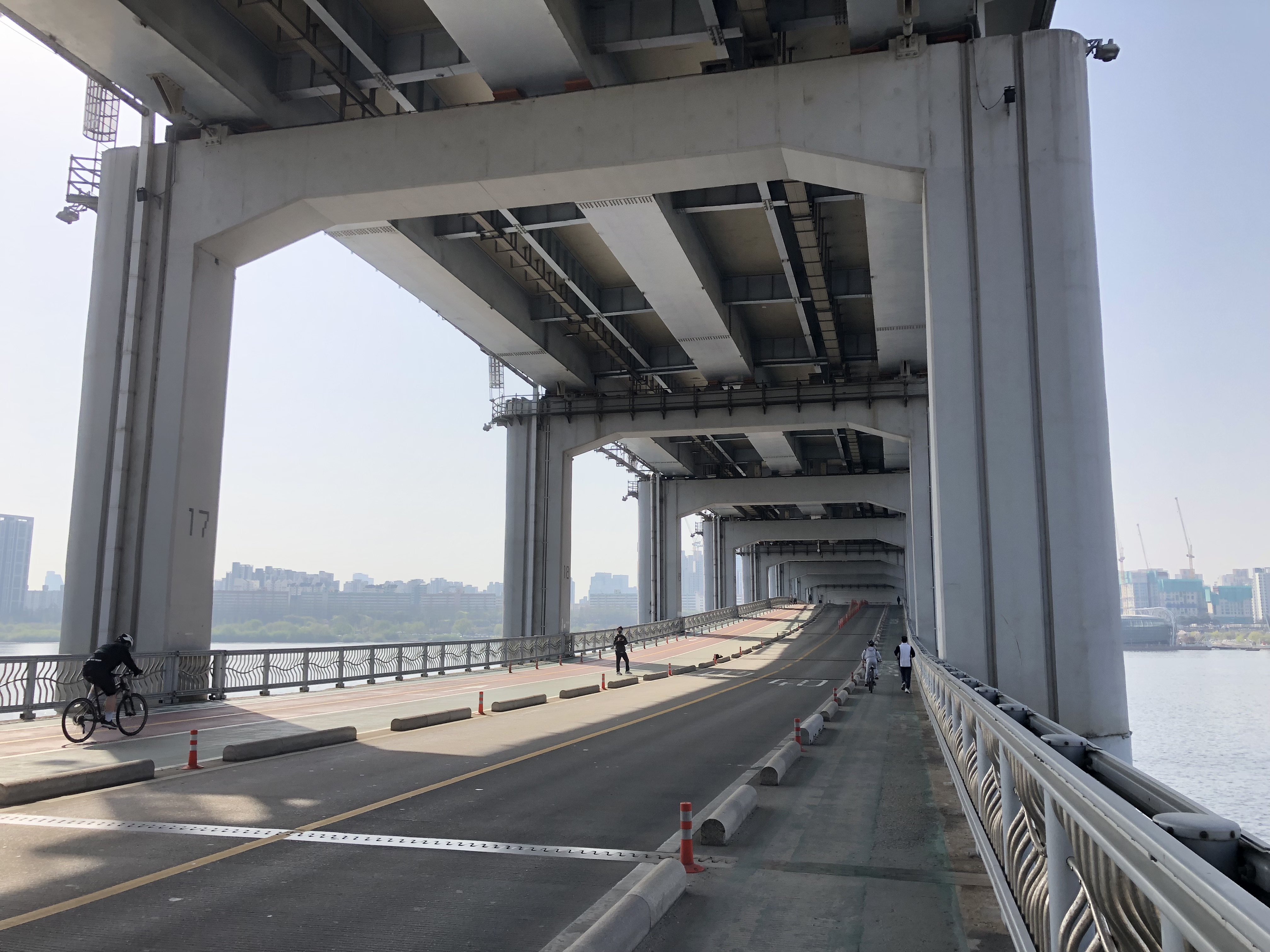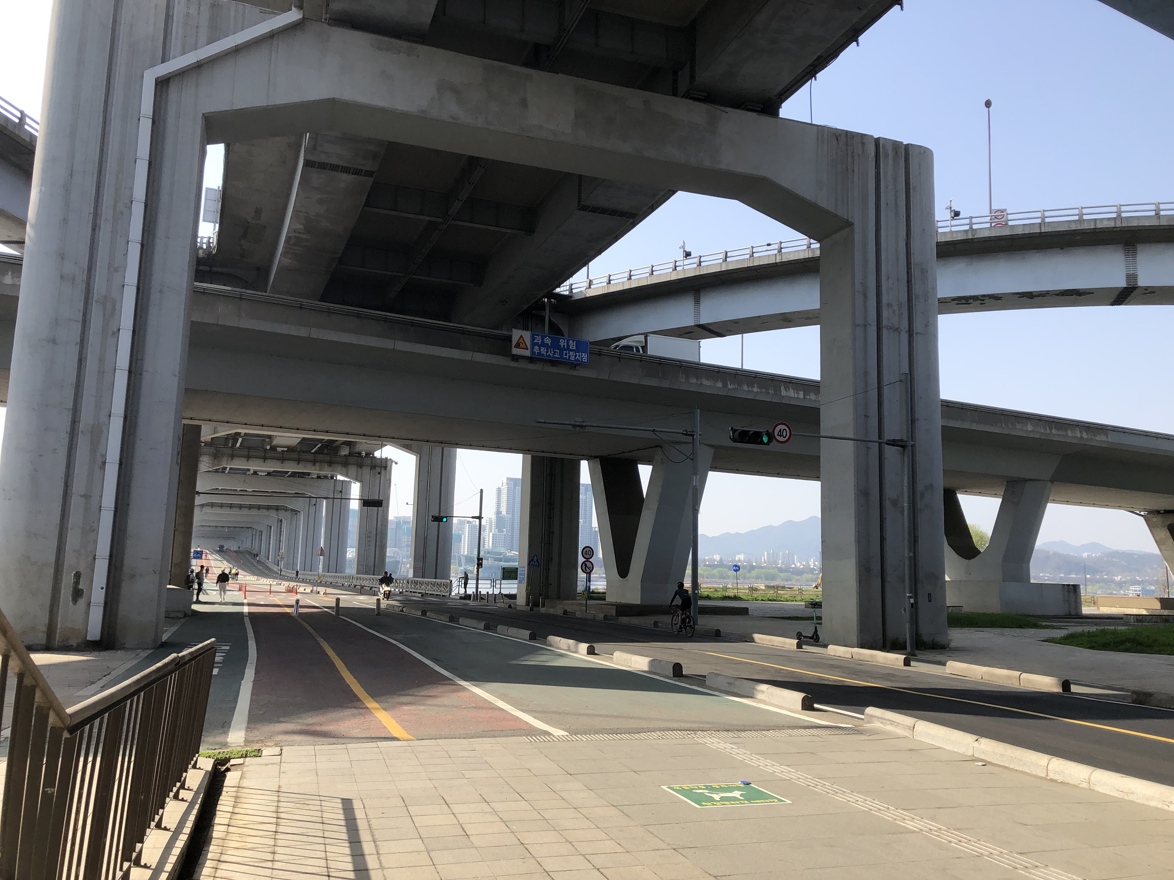 걷다 보면 멀리 한강이 보이기 시작한다. 아까 이야기한 대로 차량은 가운데 왕복 2차선으로 다닌다. 왼쪽 사이드에 자전거 도로와 인도가 있고, 오른쪽 사이드에는 인도만 있다.